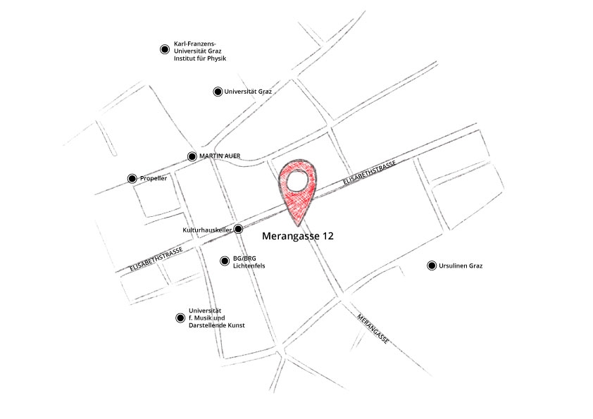 Die Haltestellen „Merangasse“ der Linien 1,7, 63 und 64 finden sich nur wenige hundert Meter entfernt.